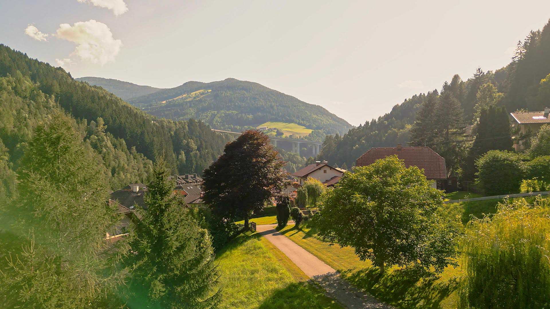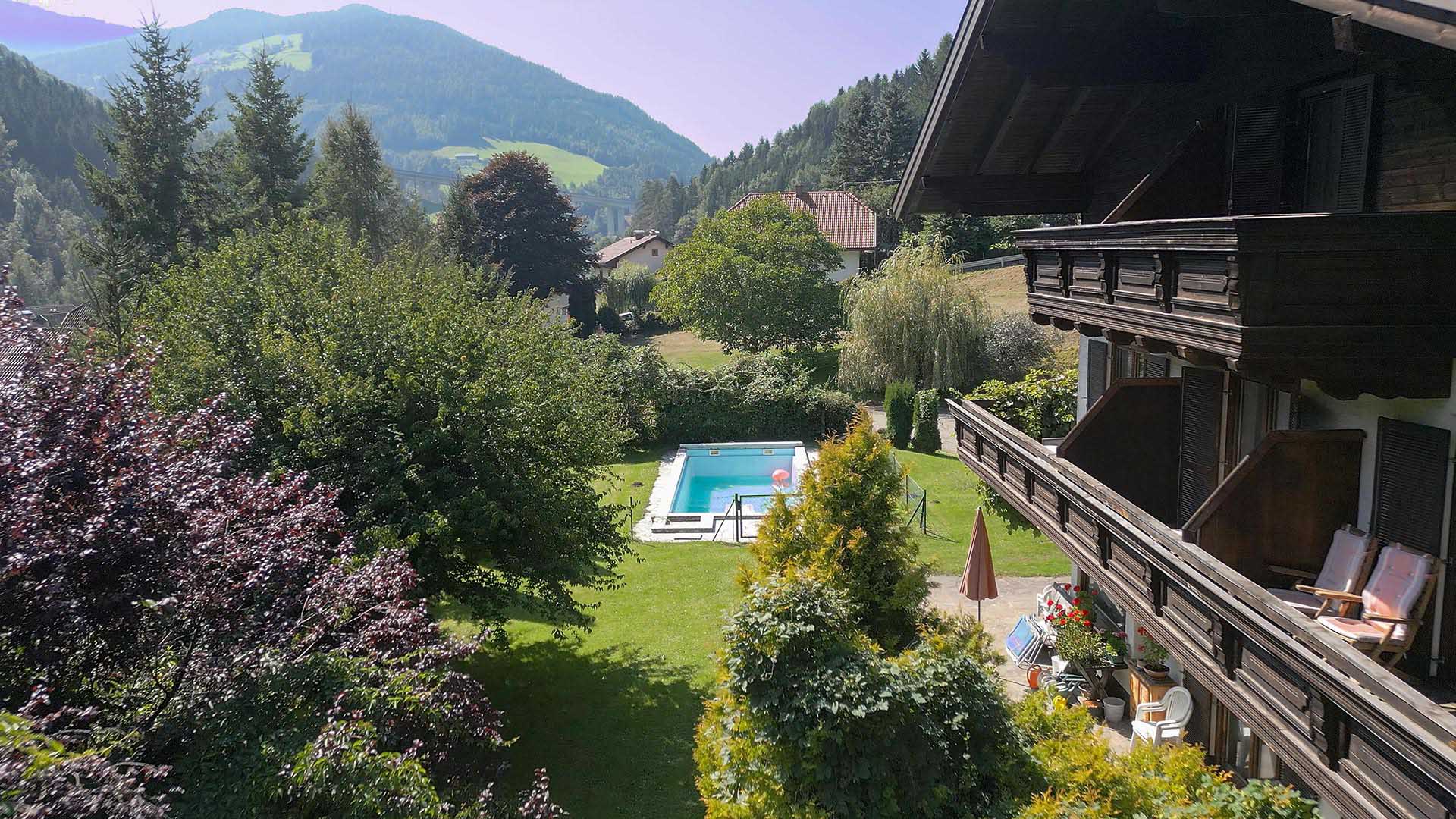 mit malerischem Ausblick auf das Grundstück und die umliegenden Berge.